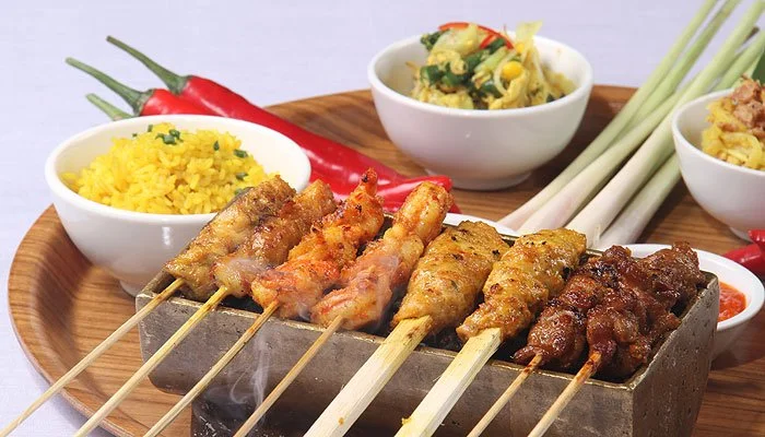 Las recetas e ingredientes varían mucho según los países, pero generalmente consiste en pedazos de carne puestos en un pincho de bambú, que se asan a la parrilla sobre brasas de carbón. Se suele usar cúrcuma para marinar los pedazos.